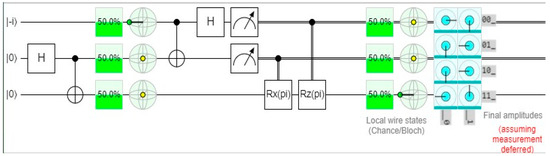 Figure 3 illustrates the successful teleportation of from position A at the beginning of the circuit to Position B at the end of the circuit. State is observed at both positions, with a probability of of it being in state if it is measured. We obtain values of and for angles and , respectively. This quantum circuit is constructed and simulated using Quirk. However, the quantum-inspired teleportation circuit in this study is implemented in MATLAB R2023b, using quantum gates in matrix form. The teleportation of any random qubit state is perfectly performed. In other words, the probability amplitudes of state components and are reproduced. The relative phase between these state components is determined through the following steps: