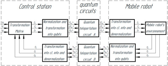 Section 2 describes the robot’s model and quantum computing tools such as teleportation using the Bell state and entanglement. The system’s architecture is then described in detail, along with the implementation of remote control for the mobile robot. Section 3 presents and discusses the simulation results, which is followed by a conclusion with a perspective in Section 4.