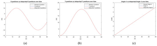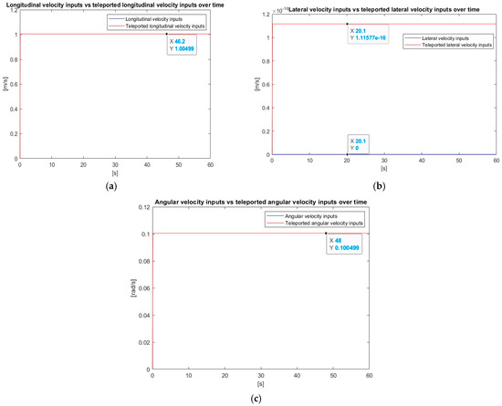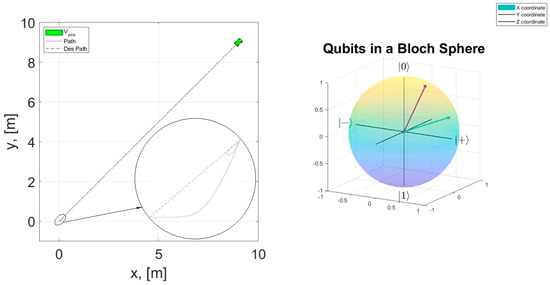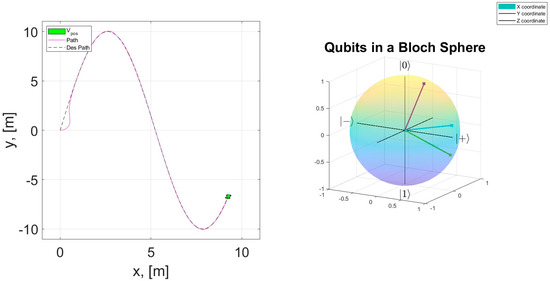 Figure 12 shows the position of the robot relative to the x-, y-, and z-axes on a 2D plane and in the Bloch sphere, where the qubits represent the different positions when the robot moves in its environment. Figure 13a shows the exponential growth of the error from 0.057 m2 at 16 s to 0.789 m2 at the end of the simulation. The initial error was nonzero because the robot started moving from a perpendicular position to the desired trajectory, then the error increased while oscillating to its first maximum of 0.579 m2 at 16 s, then decreased to a local minimum of 0.151 m2 at 27.6 s before reaching a global maximum of 1.21 m2 at 46.8 s. Figure 13b shows that when Kp and Kd were optimized, the RMSE decreased from 0.057 to 0.0002558 m2. Similarly to Figure 13a, Figure 13b depicts oscillations in the RMSE at 16 and 46.8 s, with local maxima of 0.005 m2. At these two times, the robot was located at the peak amplitudes of the sine wave trajectory. Figure 14a shows a comparison between the input and teleported linear longitudinal velocities. Both velocities increased from initial values of zero to 1.013 m/s at 0.1 s, which was the global maximum value reached at 0.1 and 30 s. The longitudinal velocity fluctuated during the simulation, with local minima of 0.276 m/s at 14, 18, 45, and 49 s and local maxima of 0.622 m/s at 15.5 and 45 s. For the lateral velocity, the nonholonomic robot did not have any forces acting on its side. The teleported lateral linear velocity increased from zero and stabilized at 6.713 × 10−20 m/s, as depicted in Figure 14b. The lateral velocity before teleportation remained zero throughout the simulation. Since the difference between these two values is minor, perfect teleportation of the lateral velocity can be assumed. The perfect correspondence between the angular velocity and the teleported angular velocity can be seen in Figure 14c. At the beginning of the simulation, both angular velocities were zero. They then decreased to −2.242 rad/s between 11.5 and 15.5 s, where the negative value indicates resistance to the car’s rotation while steering to the left side. Then the angular velocity slowly increased to zero between 15.5 and 19.5 s. After that, the angular velocity remained at zero until 43.5 s. It then started increasing, reaching 2.242 rad/s at 47.2 s, where the positive value indicates resistance to the car’s rotation while steering to the right side. The velocity then slowly decreased to zero between 47.2 and 50 s, then remained at zero until the end of the simulation. The graph of the robot’s longitudinal force presented in Figure 16 is a transform of the sinusoidal function, starting at an amplitude of 10.646 N and slowly decreasing to a local minimum of 3.131 N at 15.6 s. The longitudinal force then recovered to 10.646 N at 30.1 s. The global minimum of 1.218 N occurred at 47.1 s, after which the longitudinal force increased to 10.189 N at the end of the simulation. To compensate for the abrupt increase in the mass at 35 s, the controller increased the longitudinal force to 11.351 N. A graph of the robot’s moment of inertia is also presented in Figure 16; its value is mostly zero with two fluctuations resulting in a minimum of −1.188 Nm at 15.6 s and a maximum of 1.137 Nm at 47.1 s, where the negative (positive) value indicates resistance to the car’s rotation while steering to the left (right) side. The difference between the absolute values of these two moments of inertia demonstrates the behavior of the controller during the robustness test. The graph of the robot’s lateral force behaved similarly to that of the robot’s moment of inertia; it mostly had a value of zero with two oscillations resulting in peaks at 15.6 and 47.1 s. The first oscillation resulted in a local minimum of −0.987 N, whereas the second oscillation increased the force from 0 to 1.14 N, showcasing the effectiveness of the controller in overcoming errors introduced in the robustness test. Figure 17 depicts the linear velocity of the robot. The velocity increased from 0 to 1.064 m/s at 0.1 s, decreased to a local minimum of 0.320 m/s at 15.7 s, and increased to another local maximum at 30 s, which was followed by a global minimum of 0.19 m/s at 47.1 s. The maximum velocity of 1.15 m/s was achieved at the end of the simulation. The CLMR updated its velocity while the steering angle.