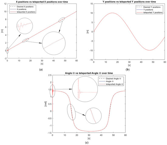 We concluded our experiment by assessing the system’s robustness by changing the mass and inertia of the robot at different times. The steering angle remained constant, whereas the velocity, forces, and moment of inertia changed to compensate for the changes in mass and inertia. A comparison of the original data and the teleported revealed their high similarity, demonstrating that the proposed teleport protocol performed flawlessly even in the test for robustness.