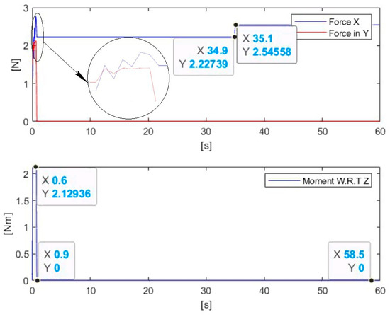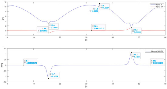 We also tested the robot’s robustness by introducing an error after 20 s by reducing the robot’s inertia by 30% and another error at 35 s by increasing its mass by 15%. These errors had no significant impact on the trajectory, because the robot controller compensated for the forces and momentum applied to the robot, as shown in Figure 23.