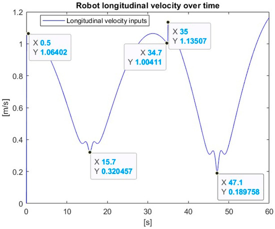 In the test of the robot robustness, the robot’s longitudinal force was 9 N and its moment of inertia was zero at the start of the simulation. At 0.1 s, the moment of inertia abruptly increased to 0.06 Nm. After 20 s, the robot’s moment of inertia with respect to the z-axis decreased to 0.0579 Nm. At 35 s, the force applied to the robot’s wheels increased to 10.8531 N and the linear velocity slightly decreased from 0.953379 to 0.952548 m/s. Then between 34.8 and 35.1 s, it suddenly increased to 1.08789 m/s then remained stable until the end of the simulation. The CLMR updated its velocity at 0.1 s while keeping the steering angle constant at 1.4321°, as shown in Figure 11.