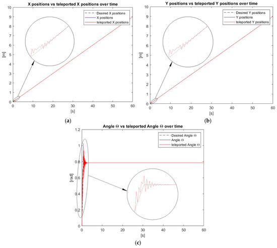 Figure 19 shows the robot’s motion along with the Bloch sphere, where the three qubits represent the robot’s positions relative to the x-, y-, and z-axes on a 2D plane. Although the initial position of the robot made an angle of with the desired trajectory, using the optimized Kp and Kd, the robot was able to improve its position to match the desired trajectory. As shown in Figure 20a, the RMSE increased almost linearly from 0 to 0.945 m2 during the simulation when the robot did not receive any feedback for corrections. For the optimized PD parameters, the RMSE increased from 0 to 0.016 m2 in the first 0.2 s, then decreased while oscillating until it stabilized at a value of 4.84 × 10−5 m2 at 5 s (Figure 20b). This stabilization was due to accurate velocity data teleported from the control station to the robot’s controller. Figure 21a depicts a comparison between the input and teleported linear longitudinal velocities. Both longitudinal velocities increased from 0 to 1.022 m/s at 0.1 s. Then at 0.5 s, they decreased, reaching 0.21 m/s at 1 s. They then remained constant for the remainder of the simulation. The teleported lateral velocity increased from 0 to 6.713 × 10−20 m/s at the start of the simulation, then remained at this value, as shown in Figure 21b, whereas the lateral velocity before teleportation remained at zero throughout the simulation. Because of the small difference between these values, perfect teleportation of the lateral velocity can be assumed. Figure 21c shows the perfect correspondence between the angular velocity and the teleported angular velocity. Both angular velocities increased from 0 to 4.089 rad/s in 0.1 s, then from 0.5 to 1 s decreased to 2.48 × 10−16 rad/s then remained constant for the remainder of the simulation. Figure 22 shows the precision of the correspondence between the real and teleported data for the x-, y- and z-positions. This affirms the precision of the correspondence between the real and teleported positions. The graphs in Figure 22a,b have similar shapes; they present the robot’s displacement relative to the global x- and y-axes. The robot’s teleported position matches the position before the teleportation. Figure 22c shows the teleported displacement of the robot in term of . The values before and after the teleportation were identical. increased from zero to the global maximum of 1.09 rad at 0.8 s while fluctuating, then stabilized at 0.786 rad at 3.2 s, a value maintained until the end of the simulation. Figure 23 shows that in the robustness test, the longitudinal force oscillated while increasing to a global maximum of 2.794 N at 0.6 s, before rapidly decreasing and stabilizing at 2.227 N at 1 s. This value was maintained until 35 s, when the longitudinal force jumped to 2.546 N to compensate for the error in the mass. This value was maintained until the end of the simulation. The lateral force was zero, except in the first 0.6 s, when it increased while oscillating to a global maximum of 2.12 N before dropping to zero for the remainder of the simulation. This value of 2.12 N was noise due to the sudden simultaneous increase in the moment of inertia to 2.13 Nm, which then returned to zero for the remainder of the simulation. Thus, the error introduced in the moment of inertia did not require compensation, as the robot moved in a straight line. Figure 24 shows that the longitudinal velocity increased while oscillating to a global maximum of 0.427 m/s at 0.6 s, before stabilizing at 2.227 m/s at 1 s. This value was maintained until 35 s, when the velocity jumped to 2.546 m/s to compensate for the error in the mass. The velocity remained at this value until the end of the simulation. The CLMR updated its velocity while the steering angle increased from 0 to in the first 0.7 s then returned to zero until the end of the simulation, as shown in Figure 25.