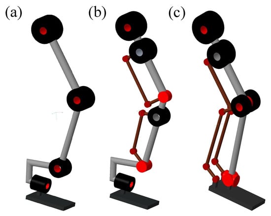 Examples of lower-limb design configurations: (a) on-axis serial mechanism, (b) off-axis serial mechanism, and (c) crank–lever parallel mechanism.