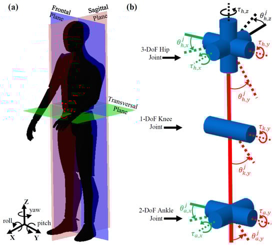 Kinematic structure: (a) main planes in human body; (b) proposed robotic leg structure for Mithra.