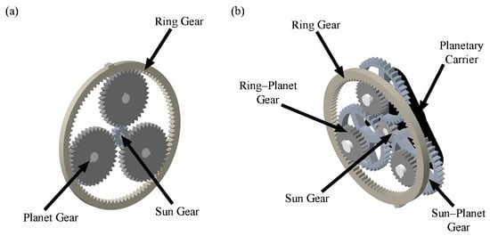 For transmissions, we considered two variations of planetary gearboxes, primarily for their significantly greater efficiency compared to harmonic gearing [42] and their simpler manufacturing in comparison to cycloid drives [43]. We excluded ball screws and roller screws from our choices, knowing that their high transmission ratios would conflict with our goal of having backdrivable actuators. Likewise, to avoid additional power losses and increased inertia, we excluded multi-stage planetary gears from our consideration. The first variation (Figure 3a) is a standard planetary gearbox with a set of planets, a sun gear, and a ring gear. This standard version typically has a gear ratio limited to 10:1. The second variation is a compound planetary gearbox (Figure 3b), allowing for greater gear ratios without compromising the transmission efficiency and with minimal additions to weight and size [44,45]. Both these planetary gearbox types were included in the optimization process for the actuator selection for Mithra.