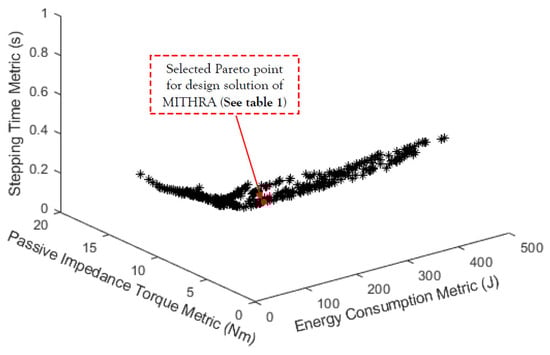 The optimization task, as formulated with its objectives and constraints, was subsequently implemented in MATLAB R2021a using the gamultiobj function alongside a controlled elitist genetic algorithm. As there are inevitably multiple objectives for the complex problem of design of a humanoid robot (characterized by three performance metrics in our proposed approach), there is not a unique optimal solution. Instead, the output of the constructed optimization framework with the proposed objectives and constraints is in the form of a Pareto set of optimal points. The final design can be chosen from these points based on the practical considerations.