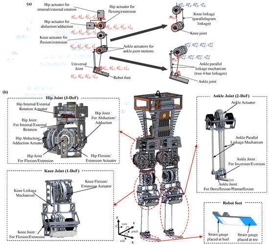 The mechanics of human locomotion have evolved over millions of years to achieve stable, compliant, and adaptive movements on various terrains [1]. Inspired by this, the majority of legged robots are designed to emulate anthropomorphic movements through developing robotic legs that generally resemble the structure of human lower limbs [2,3,4,5,6]. This facilitates their ease of operation in both human-built and natural environments, promoting effective interactions and adaptations [7]. As such, in recent years, humanoid robots have been considered for use in diverse applications, including warehouse operations, military missions, rescue efforts, healthcare, and assistance [8].