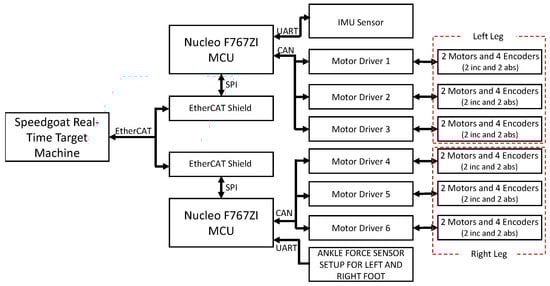 To establish communication between the motor drivers and the real-time target machine, the CAN bus protocol is utilized for its robustness, broadcast communication capabilities, reduced wiring requirements, and support for long-distance, high-speed data transmission at 1 Mbps. An integration of an MCU equipped with a high-performance ARM Cortex-M7 processor (Nucleo F767ZI, STMicroelectronics, Geneva, Switzerland) is used to facilitate the data transfer between motor controllers and the target machine. Due to the processing power limitations of the MCU resulting from the high data rates and the utilization of multiple communication interfaces, Mithra uses two MCUs to communicate with motor drivers on both legs. One of these MCUs is also used for obtaining the Euler angle data from the IMU sensor (LORD MicroStrain 3DM CX5-AHRS, MicroStrain, Williston, VT, USA) using serial communication, and the other one is for reading the foot contact force signals using serial communication from a customized circuitry setup coupled with the strain gauges of the robot’s foot. Considering the high data rates (sending commands of size 144 bytes and receiving sensory feedback of size 162 bytes within 1 ms) and the utilization of multiple communication channels simultaneously (CAN, SPI, and Serial), EtherCAT is chosen as the communication protocol between the target machine and the MCUs. The communication architecture schematic is illustrated in Figure 7.