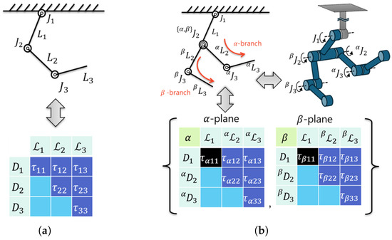 Based on the partial torque table, a partial Lagrangian is added to the column because of the presence of an additional link. is constructed as the sum of the partial torques , whereas appears because of . The partial torque can be considered as the torque generated by the i-th link and acting on the k-th joint.