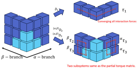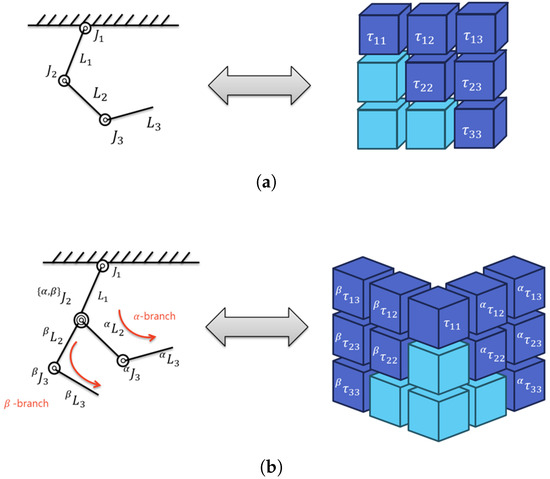 However, the black parts in the figure are placed on each plane as tensors, but physically, it means the same torque. In other words, . In tensor notation, the dimensions of the tensor correspond to the number of branches, making it possible to represent branching systems. However, it includes redundant elements. Furthermore, it is difficult to intuitively understand the structure of the system from the shape of the tensor. Additionally, it is difficult to intuitively determine which partial torques should be summed to calculate the joint torque.