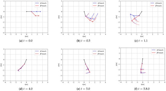 In the initial states (a), the links of branch tend to rotate clockwise under the influence of gravity, resulting in a negative torque. However, a positive torque is generated at , causing movement in the direction of joint extension. At timing (b), each end effector is accelerating, while the movement of the intermediate links is decelerating. At timing (c), the branch is swung up and nearly stationary. Similarly, for the latter timings (d) to (f), we observe a change in the torque produced in by the motion of each branch. In the latter part of the model, the motion is about to stop because of frictional damping; however, the influence of the branch, which has a higher mass, is still strong and appears to drive the entire system.