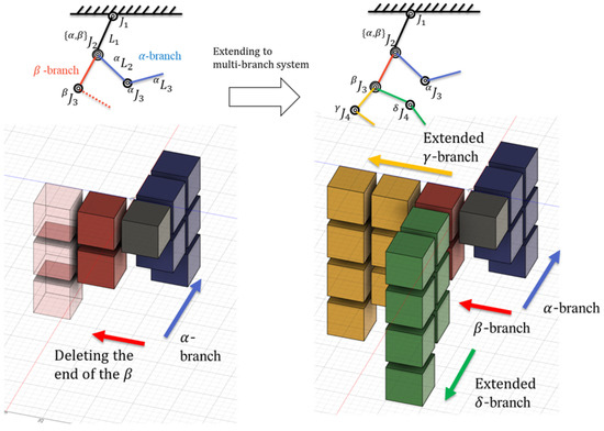 Figure 4. The effects of the branched links are consolidated into the 1st link, so in the building block representation, this is depicted by connecting those points. Therefore, in tensor notation, considering the planes for each dimension of the tensor results in redundant representations at the root of the branches. However, in building block representation, intuitive dimensional expansion is possible.