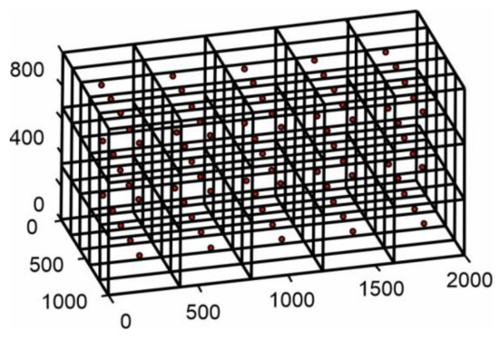 Simulation of the real world is achieved by using the methodology of a 3D grid. The 3D grid method transforms the physical world into many 3D elementary parallelepipeds. Each elementary parallelepiped has specific dimensions and represents a part of the physical space. In order to decrease the computational resources required, each elementary parallelepiped is represented by a point located at its center of gravity. The idea of a 3D grid environment is further expanded to achieve the 4D path planning creation. Figure 2 shows an example of the 3D grid environment and the centers of gravity of the elementary parallelepipeds are marked in red.