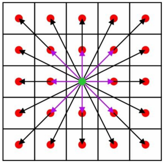 Industrial robotic arms are easily maneuverable and can move in x, y, and z directions in a 3D environment. In path planning algorithms applied in a grid environment, researchers typically use the 8-possible movement points model for agent navigation. In this paper, the 3D navigation model of 24 possible movement points presented in [41] is used. This model was chosen because of the advantages in path formation presented in [41,42]. Figure 3 shows a 2D example with the differences between the 8- and 24-possible movement points models. The agent’s location is shown in green, the purple arrows indicate their possible movement points using the 8-possible movement points model and the black arrows indicate the additional points provided by the 24-points model.