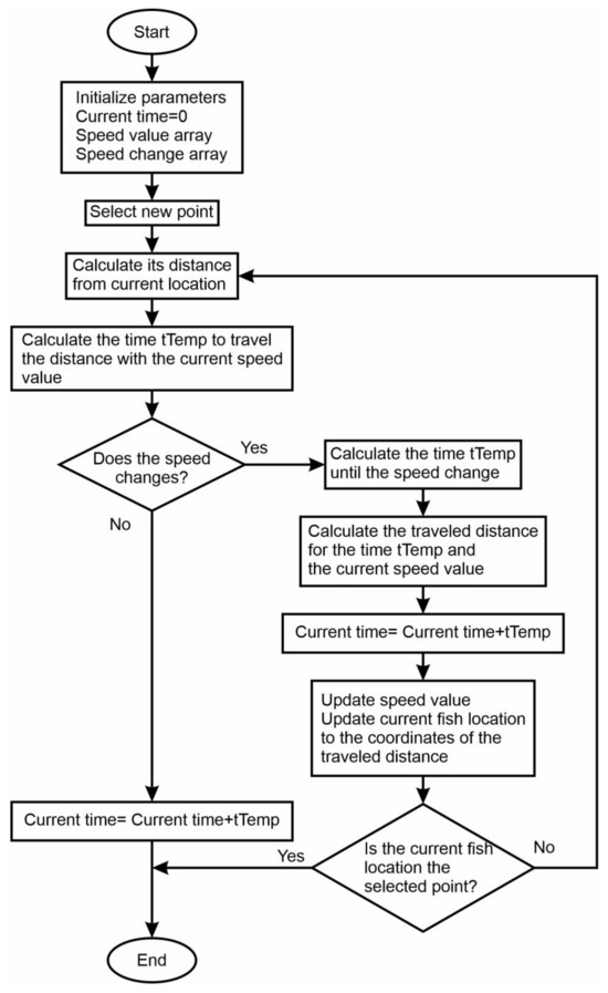 The calculation of the current time starts from an initial value t0 and is subsequently calculated using the magnitudes of the robot’s displacement and velocity. The calculation is performed every time the agent is transferred from one position in the grid to another. Equation (17) is used for the calculation of the current time. The indexes cu and tr are for the current time and distance traveled, respectively. Equation (18) is used to calculate the distance traveled and the indexes located, which next denote the point where the fish is located and the point where it moved, respectively. The change in time value, spatially, depends on the distance of the selected next point from the current one and the density of the grid.