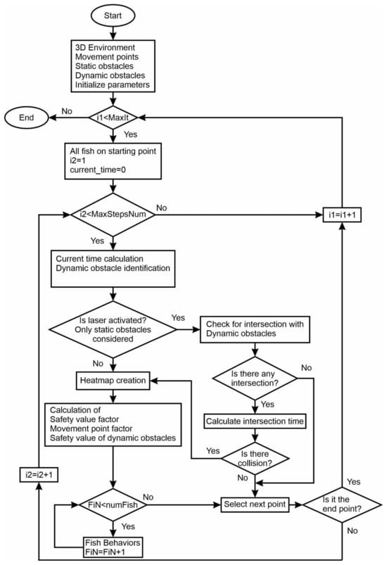 In the case of ray casting algorithm integration, it is first examined whether the laser beam is intersected by a static obstacle. If there is not an intersection and the laser has been successfully activated, then it is examined whether it hits any dynamic obstacle. If the laser does not hit any dynamic obstacle, it can be activated and the fish can move to the ending point. However, if a dynamic obstacle interferes in its path, then the required time to travel from the point where the fish is located to the point of intersection is calculated and the state of the obstacle at the time of the collision is verified. If the laser beam hits more than one dynamic obstacle, the same process is repeated for all the contact points. Laser activation is considered successful when all dynamic obstacles hit by the laser are considered free points at the time of intersection. It is particularly important to accurately determine the time of the collision between the agent and the dynamic obstacle. Thus, regardless of the grid’s density, the temporary time variable is used to calculate more accurately the collision time.