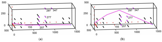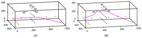 Figure 7a,b represents two different thin grid environments. The environments consist of 108 discrete points, the dimension of each 3D elementary parallelepiped is and four dynamic obstacles. There are eight and twelve static obstacles in Figure 7a and Figure 7b respectively. Green it represents the starting path point, blue the ending point, red the free points, black the static obstacle, purple the dynamic obstacles, and magenta the final path. Figure 8a,b shows the diagrams with the lengths of the paths formed during the algorithm execution for Figure 7a and Figure 7b respectively. Table 1 contains the required details for the definition of dynamic obstacles. While the discrete points of obstacles are the same, the duration of obstacles 52 and 53 changes. The speed values for both cases are speedValue = {90,85,120} mm/s and their changing times are speedChange = {6,15} s.
