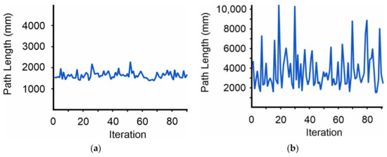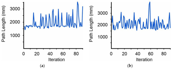 Table 2 presents the results of executing the proposed methodology in the two different environments. The path of environment Figure 7a is shorter than that of the environment in Figure 7b, indicating that choosing a path where the robot moves in the xy plane in this particular environment is shorter than when the formed path also changes in the z-axis. The algorithm’s execution time in the environment in Figure 7a is longer than in Figure 7b, which implies that the 3D paths were also examined. This is also seen by comparing the diagrams in Figure 8a,b. In the case of the environment in Figure 7b, due to the extension of the static obstacles, a 3D path must necessarily be formed to connect the starting and ending points. Figure 8a shows that the lengths of these paths are greater than 1500 mm, with the values of the sub-optimal paths ranging from 1700 to 2400 mm. These path values are also found in Figure 8a. Another reason why the algorithm runs faster in environment 2 is the existence of more obstacles. Due to the fact that the 3D model of 24 possible movement points contains many choices of the next movement point selection, bio-inspired algorithms such as AFSA face the difficulty of choosing the next movement point. The presence of more obstacles reduces the number of possible movement points and facilitates the selection process [42]. It is also observed that for the case of the environment in Figure 7b, the average and maximum lengths of the formed paths are much greater compared to the environment of Figure 7a. However, as can be seen from Figure 8b, the formed paths with great length are few. This indicates that the operating environment is well explored and several cases have been examined before determining the optimal path. Moreover, the paths with great length shown in Figure 8b show that the non-optimal path formation can also cause changes in the numerical values of the robot’s speed and the current time variable increases. Therefore, if the access to the ending point is restricted by dynamic obstacles, the path length increases until the ending point is successfully reached. These cases can be limited by reducing the numerical value of the parameter MaxStepsNum. These errors do not affect the formation of the next path. This is demonstrated in Figure 8b by the numerical values of the paths formed after the paths with great length. Their numerical values are shorter and independent of the previous path. Their independence is highlighted as well as by the general attribute of the AFSA not to exchange information with the environment based on previous paths.