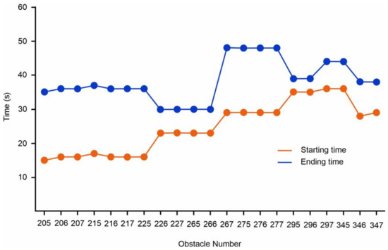 In this scenario the static obstacle can be a manufactured component and the dynamic can represent the movement of a human’s hand while working in this position for a set of time frame during the assembling process. Between the two environments there is a difference in the number and form of static obstacles. In the environment of Figure 7b, some additional static obstacles were added so that, in combination with the change in the duration of the dynamic obstacles, the behavior of the proposed methodology can be demonstrated in a different environment where the optimal path is forced to pass through the dynamic obstacles that disappear. It is noted that in the environment of Figure 7b the path that connects the starting to ending point necessarily passes only over the static obstacles, while in the environment of Figure 7a it can also pass around them. In the environment of Figure 7a the dynamic obstacles do not substantially affect the course and form of the optimal path; however, they affect the examination of alternative paths during the algorithm’s execution. During the algorithm’s execution, when the agent is located at point 35, by following the optimal path, the numerical value of the time variable is current time = 7.37 s. In environment Figure 7a, all dynamic obstacles at that time are considered as obstacles; while in environment Figure 7b, point 53 is considered as free. In the example in Figure 7a, the time interval between the current time and the time when point 53 will be considered as free is short. Thus, suboptimal path generation from the starting point to point 35 may lead to a path shorter in length because point 53 will be considered free. In this example, this possibility does not arise because the existence of dynamic obstacles does not affect the length of the optimal path.