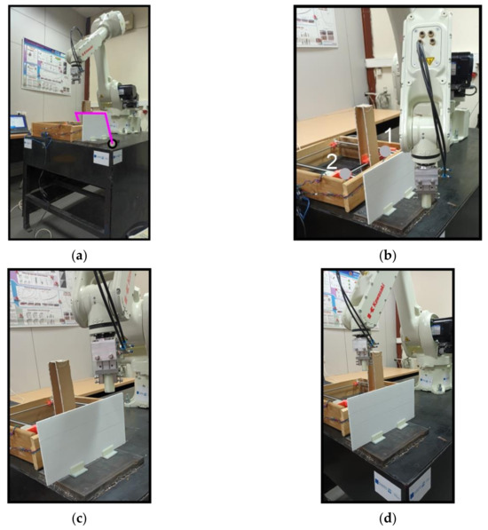 An experimental set-up was utilized to implement the presented approach in real-world processes. The experimental setup includes an industrial robotic arm, a mechanism that can reciprocate a dynamic obstacle and multiple static obstacles. The reciprocating motion of the mechanism can simulate the motion that a smaller robotic arm would perform in Industry 5.0 for accomplishing a task. The reciprocating mechanism is situated within the operational environment of the industrial robot and executes a predetermined movement. The objective of the robotic arm is to transfer an object from a starting to an ending location without causing any collision along the traveled path. The experimental setting exemplifies the circumstances and requirements encountered in Industry 5.0, establishing a suitable environment for the safe investigation of the suggested approach, mitigating the risks of damaging costly equipment, inflicting injuries, or impacting facilities. The experimental set-up aims to generate environments of similar specifications to those depicted in Figure 1b. Figure 12 shows the experimental set-up with the industrial robotic arm and static and dynamic obstacles. Figure 12b–f shows the location of the robot’s end effector during the path execution. The numbers and gray points shown in Figure 12b indicate the extreme positions that the dynamic obstacle can move to. When the robot is close to the static obstacle as depicted in Figure 12c, the course of the dynamic obstacle is from position 1 to position 2. On the contrary, when the robot is in the position depicted in Figure 12d, the dynamic obstacle moves from position 2 to position 1. Figure 12g shows the 3D model of the robot’s operating environment and the resulting path. The numbers of static obstacles, dynamic obstacles, and free movement points of the grid environment are greater than the previous examples. Figure 12h contains information about dynamic obstacles and the reciprocating movement simulation. The same points are met as dynamic obstacles at different times.