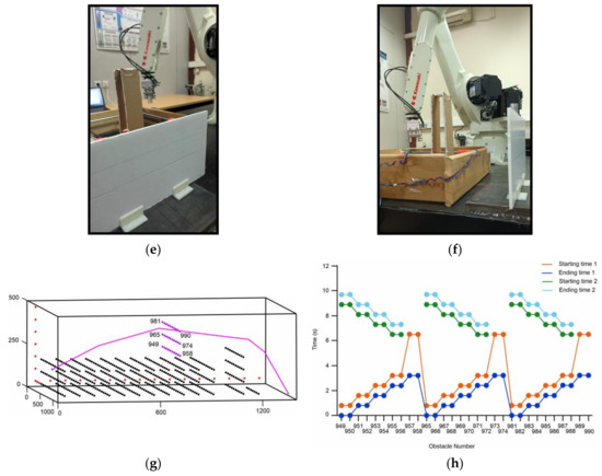 The application of the proposed methodology to an experimental set-up that simulates the operation conditions met in industry 5.0 for the collaboration between two robots: (a) Operational environment of industrial robotic arm; (b–f) execution of the resulting path by the industrial robotic arm during the operation of the reciprocating mechanism; (g) the grid environment modeling and the resulting path using the proposed methodology; and (h) diagram of starting and ending time of the dynamic obstacles in the real-world application.