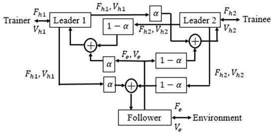 For the proposed robotic rehabilitation platform, a multilateral leader–follower architecture with multiple leaders and a single follower is adopted. In typical single leader–single follower systems, the leader robot is handled by a human who intends to manipulate objects in an environment. A follower robot, which replicates the motion of the leader robot, is placed in the environment, providing force feedback to the leader so that the human undergoes a “transparent” experience of touching the object [