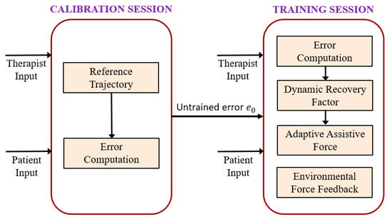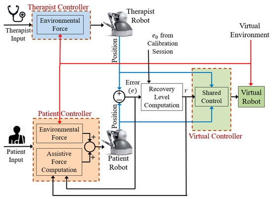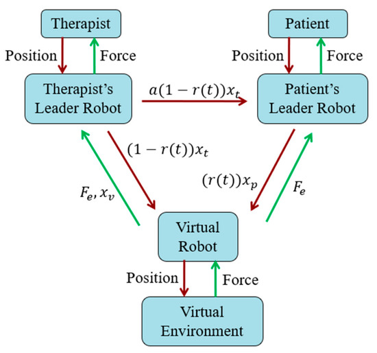and are the positions of the therapist’s robot, the patient’s robot, and the virtual robot, respectively. is the environmental force, is the recovery level, and is the assistance level to the patient.