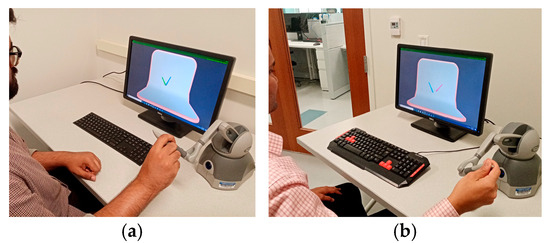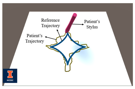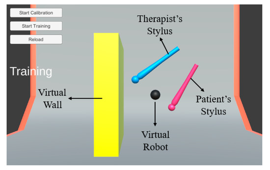 The training session is carried out in a virtual environment, in which the patient has to learn to perform activities of daily living. Each virtual environment is modeled as a mass–spring–damper, and the corresponding dynamics are transmitted back to the robot’s dynamics (Equation (16)) so that the exact environmental forces are experienced by each user. As a preliminary step, a simple virtual environment is modeled, which has a wall rendering high-stiffness forces on the operators. A high-stiffness obstacle is purposely chosen here since stability proven in this case implies stability with lesser stiffness obstacles [