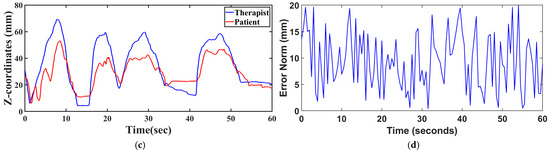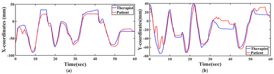 Figure 2) and the proposed controllers (shown in (7) and (15)) are implemented in the system, the Cartesian coordinates of the end-effector (stylus) of both the therapist and the patient’s robots are recorded during the training session. These position values, along with the error in each dimension, are reported in