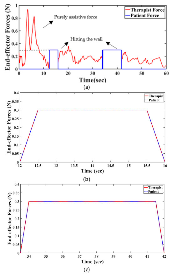 Figure 9a–c that, during the time interval of collisions, the positions of both these robots remain almost constant. During this collision period, the patient’s stopping position need not exactly be the wall position, since the therapists may prefer to give them full force feedback even if they have not yet reached perfection in position tracking.
