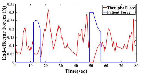 Figure 11 that during the environmental collision, both the therapist and the patient’s forces indeed overlap. And the magnitude of the force experienced is the same as the force that the virtual wall is modeled to render, irrespective of the recovery factor. At the instances when there is no collision, it can be observed from
