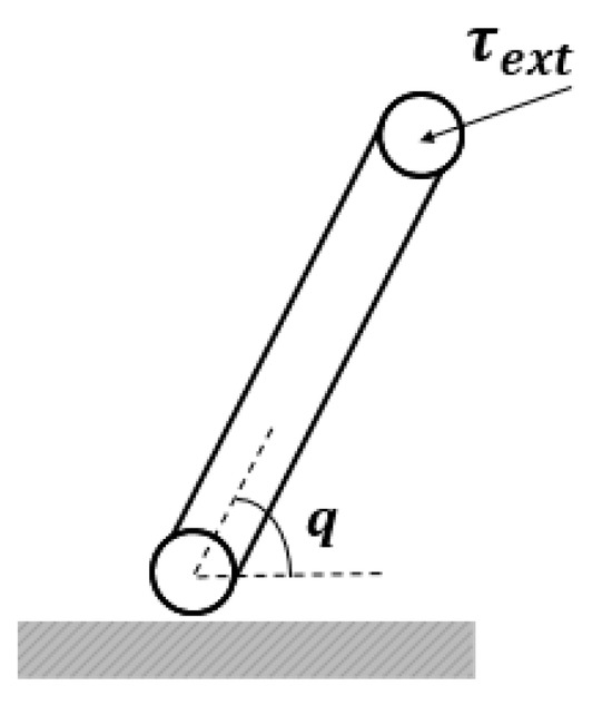 A link with a mass of 100 g and a length of 10 cm is attached to a rotary joint along the axis perpendicular to the ground. The joint angle from the base is measured in the anti-clockwise direction as . is the external torque applied by the therapist, the patient, or the environment, depending on the robot under consideration. This is denoted as , , and in (4)–(6). In practice, the external torque upon both leader robots is applied in the form of position inputs from the user, and for the virtual robot, it is directly applied in the form of torque from the environment. Thus, the position inputs from the therapist and patient are represented by and , respectively. Throughout the simulations, it is assumed that the initial position of all three robots is
