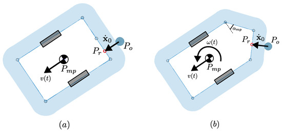 If an obstacle obstructs the robot’s movement, the proposed motion control system can dynamically adjust the trajectory in real time. When the platform approaches an obstacle and the separation distance falls below a critical threshold, defined by the safety radius r, a repulsive velocity vector is generated. Consequently, the platform is surrounded by a safety area that takes the shape of a rectangle with rounded corners, each with a common radius r, as shown in Figure 2a. This safety region can be visualized as a vertical extrusion of the safety area. The repulsive velocity vector is applied at the point , which corresponds to the closest point on the platform’s contour to the obstacle’s position (Figure 2). The magnitude of acts as a control parameter, while its direction is determined by the unit vector along the distance , resulting in .