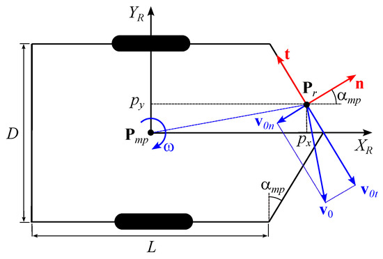Here, represents the velocity of the base in the global reference system, with indicating the position of the central point of the mobile robot. The orientation of the robot with respect to the axis of the global reference frame W is given by .