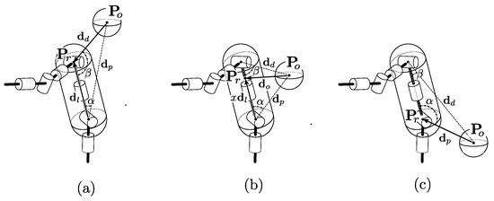 The robot’s movement is affected by the presence of an obstacle when the distance is less than a certain radius r, a parameter intrinsic to the algorithm. Consequently, the pertinent zone of each link can be conceptualized as a cylindrical structure bounded by two hemispheres, all of which share the radius r. The repulsive velocity is therefore implemented at the point . More specifically: