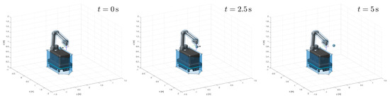 Figure 18 illustrates the robot’s motion, with frames captured at intervals between and . Obstacles are represented as circles and as the robot enters their region of influence, the algorithm responds by generating a repulsive velocity component to change its trajectory. The plotted paths include both the initially planned path (dashed line) and the actual trajectory adjusted by the avoidance algorithm (solid line). As the robot overcomes the obstacle, the control strategy progressively corrects any deviation through a proportional feedback mechanism, ensuring that the robot returns to the planned path. Furthermore, Figure 18 highlights the closest interaction point , which represents the segment of the robot’s footprint most at risk of collision. This critical point is marked with a small circle to emphasize its role in the obstacle avoidance process. When the robot is in zone 2, the weights associated with the mobile robot and manipulator are and , respectively. In this way, movement priority is given to the mobile base. When the mobile manipulator arrives close enough to the target point , it enters zone 3 and equal importance is given to the movements of the manipulator and the platform ().