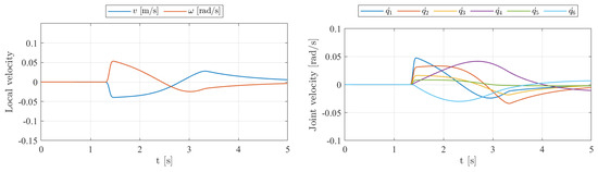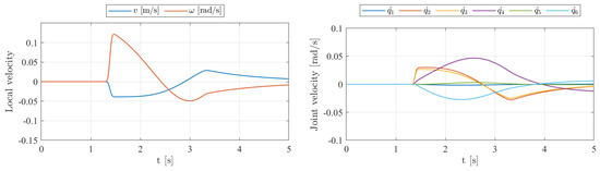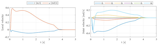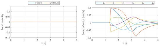 Since the analyzed system is redundant, it has the ability to respond to the presence of obstacles in various ways. For instance, if the mobile manipulator is stationary and an obstacle interferes with the end-effector, it is possible to react by applying a velocity to all elements of the joint space. This would result in the movement of both the robotic arm and the mobile base. Alternatively, the system can respond by moving only the mobile platform, applying velocities primarily to v and , while the arm reaches very low velocities or, in extreme cases, remains stationary. For this purpose, the weighted pseudoinverse matrix can be used, where is the Jacobian and is a diagonal matrix of the weights associated with each element of the joint space [53,54]. Its formulation is given by