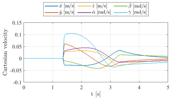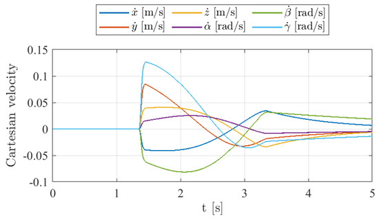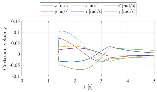 where denotes the position of the end-effector, and indicates the desired planned variable. Instead, , and are the unit vectors of the end-effector reference frame. In (17), the error is multiplied by , where is a gain vector. It is possible to give different gains to the orientation () or positioning () components of the error.