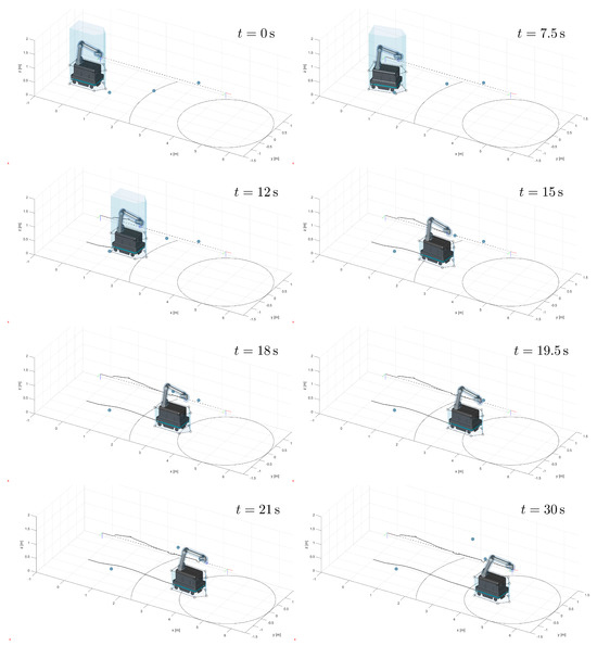 Example 3: Frames of the simulation showing the mobile manipulator and the safety volumes.