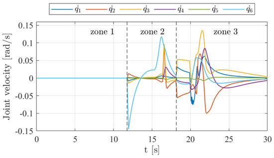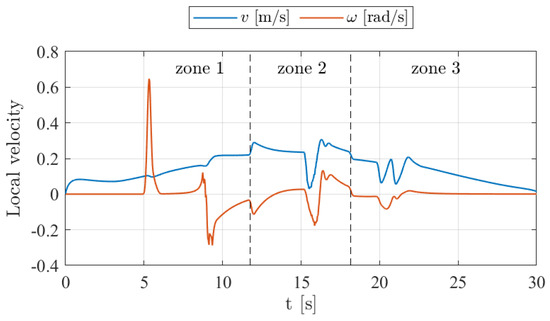 The speed profiles of the mobile robot and manipulator are shown in Figure 20 and Figure 21, respectively. The velocity profile v and of the mobile robot has peaks mainly in the first two areas, as it has priority of movement. In Figure 21, the separation into the three zones is evident. In zone 1, the joint velocity is zero, as the manipulator is not used for either planning or obstacle avoidance. In zone 2, there is a joint velocity trend, but with reduced values compared to zone 3, as it can move but still giving priority to the moving base. In addition, in zone 3 the manipulator interferes with the third obstacle twice: the first involves the end-effector and the second a part of the wrist. In both cases, the algorithm generates a repulsive velocity that allows for the obstacle to be avoided.