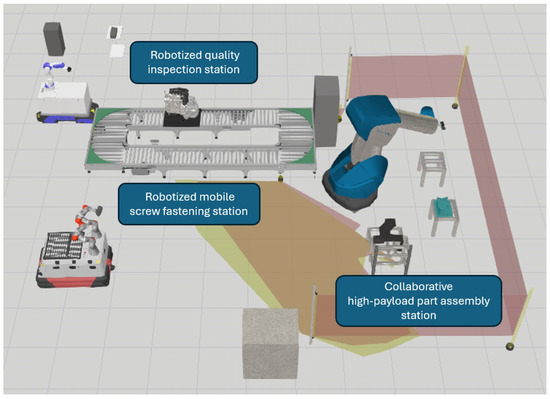 As presented in the previous section, the proposed layout is composed of three different stations: The collaborative high-payload part assembly, robotized mobile screw fastening, and robotized quality inspection stations. The following paragraphs provide further details of each of the stations.