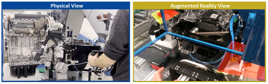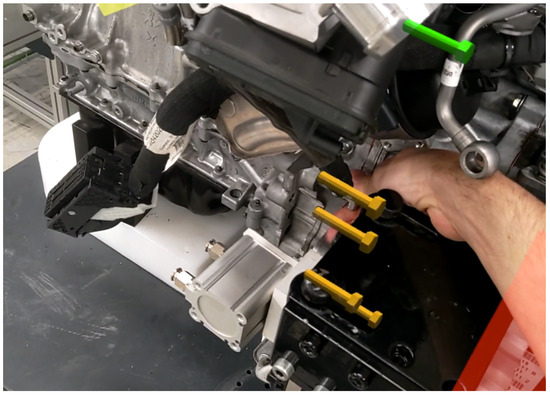 Additionally, an augmented reality application has been developed to ensure the correct execution of the task. Specifically, the AR application guides the operators on the location of bolts that must be assembled on both the engine and the gearbox, as shown in Figure 4. The location of the bolts is presented inside the virtual world of the AR application using holograms, assisting operators and avoiding assembly errors. After the execution of the screwing tasks, the operator is able to inform the production system about the completion of the tasks using a virtual button and several custom-designed interfaces for the connection of the AR application with the production system.