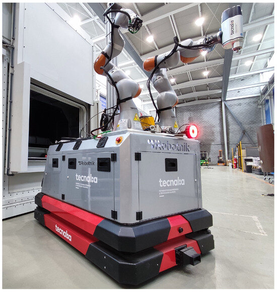- Omnidirectional mobile platform with mechanum wheels [22] able to move at a speed of up to 1.0 m/s. The platform is equipped with two Kuka LBR iiwa 7 [23] manipulators in a dual-arm configuration, although a single arm is used for the presented process.