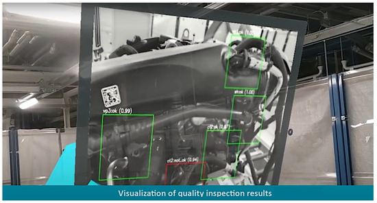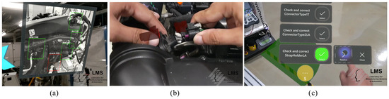 Additionally, the station is enhanced by an AR application that operators use to interact with the quality inspection system. Once the developed quality inspection module evaluates the correct installation of parts (screws, valve pipes, and connectors) on the engine and gearbox assembly, the operator’s intervention is requested whenever an incorrect assembly is detected. Initially, the AR application provides the quality inspection results, see Figure 8a, as well as corrective instructions to operators in the form of holograms, Figure 8b. Whenever a faulty part is detected, operators approach the engine and follow the instructions provided by the AR application, using virtual buttons to interact with the system. Finally, the operator can validate that the proposed corrective actions have been completed, informing the system that the product is ready for the next stage of the production line as shown in Figure 8c.