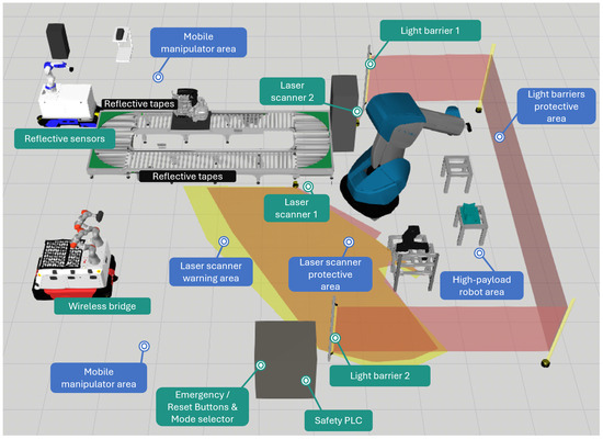 A key component for the implementation of the proposed human-centric robotic solution is the design and implementation of a safety concept to ensure the well-being and security of human operators when working in shared workspaces with robotic resources. As the presented assembly cell includes multiple robots, both high-payload industrial and mobile manipulators, as well as collaborative tasks between robots and humans, it is necessary to define a layout that considers all these previous aspects. The safety layout specifically designed for the pilot is illustrated in Figure 9.