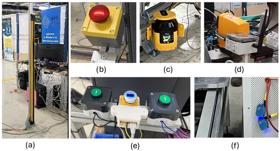 Figure 10. Safety devices for HRC collaborative assembly cell: (a) light barriers, (b) emergency and reset buttons, (c) laser scanners, (d) wireless safe bridge, (e) mode selector, and (f) retroreflective sensors. - Emergency and reset buttons: After analysing the layout of the robotic cell as well as the human and robotic tasks towards motor and gearbox parts’ assembly, six emergency stop buttons (Figure 10b) and one reset button have been installed within the cell layout. The emergency buttons stop the assembly process whenever operators perceive any emergency situation. On the contrary, the reset button enables operators to resume the assembly process after any emergency stop, safely resuming the process by pushing the button. All these buttons are integrated with the safety PLC of the robotic cell to ensure immediate response in case of an emergency event.