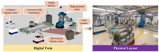 Finally, the proposed robotic cell is completed with a Digital Twin, a digital model representing the status of the complete cell (robots, engine, operator, and security status) in real-time. The implemented Digital Twin module seamlessly interfaces with the different elements of the cell through the Robot Operating System (ROS) to receive real-time data of robots and sensors, crucial for creating an accurate digital replica of the physical workstation. This module captures a diverse set of information derived from ROS, including robots’ joint states, enable/disable signals of grippers’ and conveyor’s actuators, precise cues of the picking and placing of gearbox and motor parts, as well as the result of the object detection and quality inspection modules. Additionally, it incorporates data derived from safety scanner sensors, ensuring the reliable visualization of safety zones’ shape. The digital simulation software Visual Components is included to facilitate the visualization of the data managed by the Digitial Twin module. Figure 11 shows the Digital Twin module alongside the physical world of the developed human-centric robotic cell.