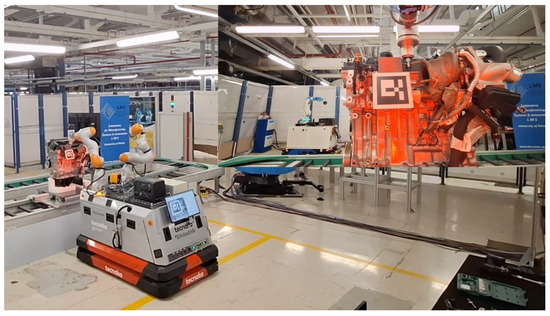 Specifically, the proposed robotized quality inspection station includes a mobile inspection unit, composed of a mobile manipulator with an embedded vision device, which offers flexibility to carry out inspection activities along the assembly. In particular, the quality of the assembly of the engine and gearbox is conducted through a RC Visard 65 (Roboception, Munich, Germany) stereo camera [28] mounted on a Comau mobile manipulator, see Figure 7. This custom platform, composed of a Comau Agile 1500 AGV [29] and the Racer 5 Cobot [30], provides the capability to autonomously navigate around the shopfloor executing quality inspection tasks along the assembly line.