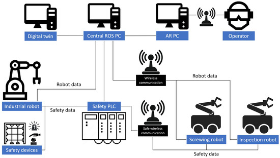 - The central element is the central ROS PC, which manages all the robot and safety information and triggers the different robot actions. It also distributes all required information to the digital twin PC and interacts with the operator through the AR PC.